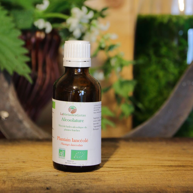Alcool* 65°, Eau de source, Feuilles de Plantain lancéolé (Plantago lanceolata)*